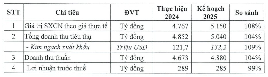 Tại Đại hội, cổ đông đã thông qua kế hoạch sản xuất kinh doanh cho năm 2025 với doanh thu thuần đạt 4.880 tỷ đồng, tăng 4% so với thực hiện năm 2024 và lợi nhuận trước thuế 285 tỷ đồng, giảm 1% so với thực hiện năm 2024.