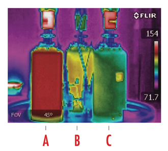 Trong các điều kiện thử nghiệm được kiểm soát, giá trị cách nhiệt của Aerolon được so sánh với loại sơn cạnh tranh, chứa các hạt gốm rỗng và cả bình chứa không tráng phủ. Cả ba thùng đều được làm nóng đến cùng một nhiệt độ bên trong không đổi. Sử dụng hình ảnh nhiệt (ảnh bên dưới), bạn sẽ thấy bề mặt màu đỏ tươi của bình không sơn (A), cho thấy mức truyền nhiệt cao. Bể được phủ gốm (B) có các điểm nóng màu vàng cam. Trong trường hợp này, lò sưởi hoạt động với mức tiêu thụ năng lượng trung bình ít hơn 27% so với bình không sơn khi duy trì cùng nhiệt độ. Bình chứa bên phải (C) được sơn Aerolon, ngoại trừ một phần bị cắt nhỏ. Bề mặt của bình được sơn Aerolon cho thấy sự truyền nhiệt rất ít (so sánh màu bề mặt xanh lam mát mẻ với phần cắt màu vàng cam) và bộ sưởi hoạt động với mức tiêu thụ năng lượng trung bình ít hơn 45% so với bình không tráng, cho thấy mức tiêu thụ năng lượng cao hơn hiệu suất nhiệt.