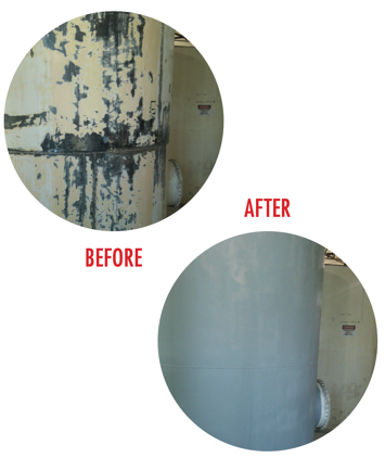 Những hình ảnh nổi bật này thể hiện các bức ảnh trước và sau của dự án sơn bể chứa. Hệ thống sơn phủ Aerolon được áp dụng ở bên phải. Lớp sơn lót epoxy gốc nước được sử dụng làm lớp nền chống ăn mòn cho lớp phủ Acrylic Series 971 Aerolon. Sau đó, một lớp sơn phủ hiệu suất cao được thêm vào. Lưu ý rằng thay vì quá trình cắt, tạo hình, bọc và ốp bể tốn nhiều thời gian, hệ thống phủ Aerolon được thi công phun trong thời gian ngắn hơn nhiều.