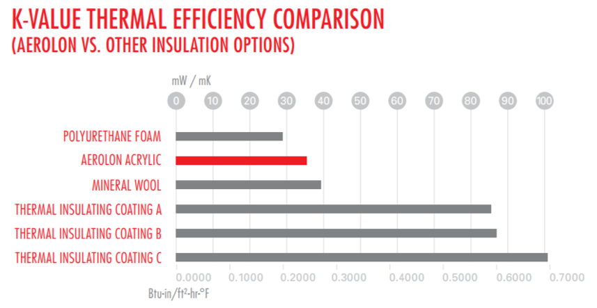 Giá trị K càng thấp thì đặc tính cách nhiệt càng tốt. Điều này cho thấy Aerolon so sánh như thế nào với vật liệu cách nhiệt thông thường và các loại sơn cách nhiệt khác.