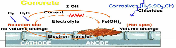 Như chúng ta đều biết, ăn mòn kim loại là một quá trình tự diễn biến tự nhiên do không bền vững nhiệt động học nên kim loại có xu hướng quay trở về dạng nguyên thể ban đầu là quặng của kim loại khi có tác động của môi trường như độ ẩm, không khí và các chất gây ăn mòn. Vì thế việc chống ăn mòn kim loại thực chất là tìm các giải pháp giảm tốc độ ăn mòn kim loại đến mức độ thiết kế có thể chấp nhận được. Cốt thép bê tông bị ăn mòn do có nhiều nguyên nhân như: thép đã đã bị rỉ trước khi đổ bê tông, hoặc bê tông chịu các xung lực trong quá trình sử dụng dẫn tới liên kết bám dính giữa bê tông và thép giảm, hình thành các khoảng trống tạo điều kiện cho không khí, độ ẩm và tác nhân ăn mòn gây tác dụng. Ăn mòn cốt thép bê tông cũng có thể do chất lượng bê tông kém nên theo thời gian nước thấm vào bề mặt và gây ẩm cốt thép tạo điều kiện cho các quá trình ăn mòn điện hóa diễn ra. Hậu quả của quá trình ăn mòn điện hóa xảy ra trên bề mặt cốt thép trong bê tông sẽ tạo thành lớp rỉ: FeO và Fe2O3 làm tăng thể tích cốt thép từ 7 đến 10 lần đạt tới ứng suất làm nứt bê tông và phá hủy công trình. Các tác nhân khác gây ăn mòn cho cốt thép còn là quá trình cacbonat hóa từ khí CO2 tạo thành calcium carbonate cũng như sự xâm thưc clo là chất gây ăn mòn rất mạnh.