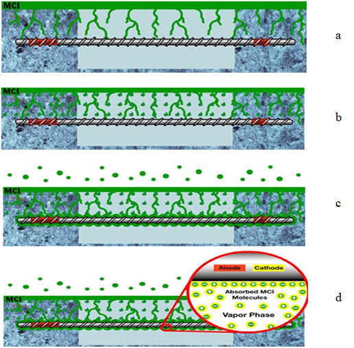 Việc sửa chữa công trình, nhất là móng, mà cốt thép đã bị rỉ thì MCI được dùng dưới dạng vữa trát lên bê tông và sau thời gian MCI sẽ thẩm thấu qua bê tông tới thép để ức chế ăn mòn là giảm tốc độ rỉ của thép (Hình 5). Trát lớp vữa MCI ( màu xanh) lên bề mặt bê tông bị hỏng (Hình 5a) và MCI sẽ thẩm thấu qua bê tông theo nguyên lý mao dẫn. Nhờ tính năng phân tán và bay hơi nên MCI sẽ nhanh chóng tiếp cận đến bề mặt thép (Hình 5b). Do MCI có ái lực rất lớn với kim loại nên các phân tử MCI hấp phụ thành lớp màng ức chế bao bọc quanh cốt thép, ngăn cách thép tiếp xúc với các tác nhân ăn mòn. Màng ức chế có chứa nitơ và có điện trở cao, nên cũng có tác dụng làm giảm dòng điện ăn mòn. Ngoài ra Cortec MCI có thêm tính năng đặc biệt mà các MCI thông thường khác không có là khả năng phân cực thành các ion âm và dương, tiếp cận các khu vực điện tích trái dấu, làm cân bằng điện tích bề mặt do đó giảm tốc độ ăn mòn điện hóa (Hình 5d).