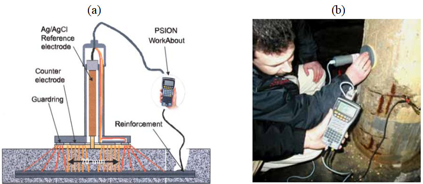Hình 6. Nguyên lý thiết bị đo GalvaPulse (a) và thực hiện quá trình xác định tốc độ ăn mòn cốt thép bê tông (b)