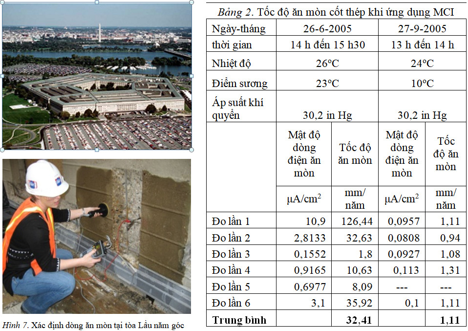 Một phần tòa nhà Lầu Năm góc sau sự kiện 11 tháng 9 bị hư hỏng và khi tiến hành sửa chữa người ta phát hiện các cốt thép bị đã ăn mòn rất nhiều. Cortec Corporation được Lầu Năm góc mời đến xử lý với dự án bắt đầu 2003 và kết thúc 2012 (Hình 7). Cortec Corporation dùng vữa MCI trát lên các khu vực hư hỏng và cứ 3 đến 6 tháng 1 lần tiến hành đo tốc độ ăn mòn cốt thép bằng thiết bị GalvaPulse. Bảng 2 trình bày kết quả đo 2 thời điển năm 2005 cho thấy chỉ sau 3 tháng tốc độ ăn mòn cốt thép giảm từ 32,44 μm/năm xuống còn 1,11 μm/năm.